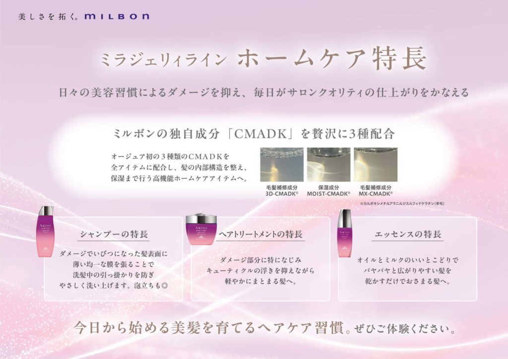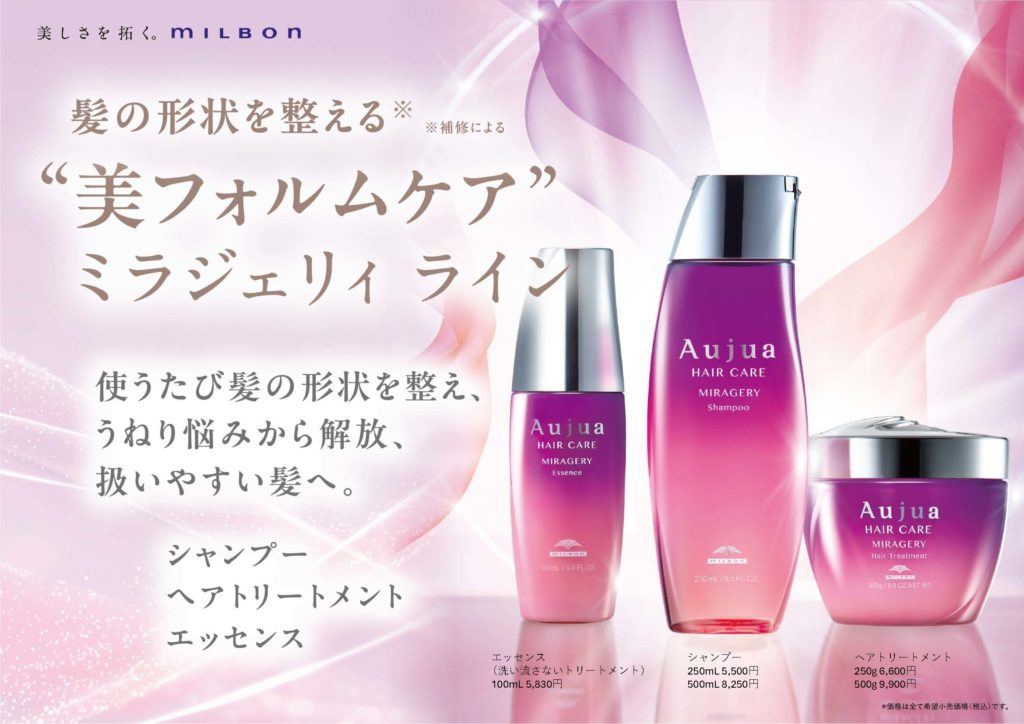 Aujua「ミラジェリィ」は、じりじりと広がりフォルムが乱れた毛髪を内部構造から整え、扱いやすく美しい髪へ導くヘアケアシリーズです。